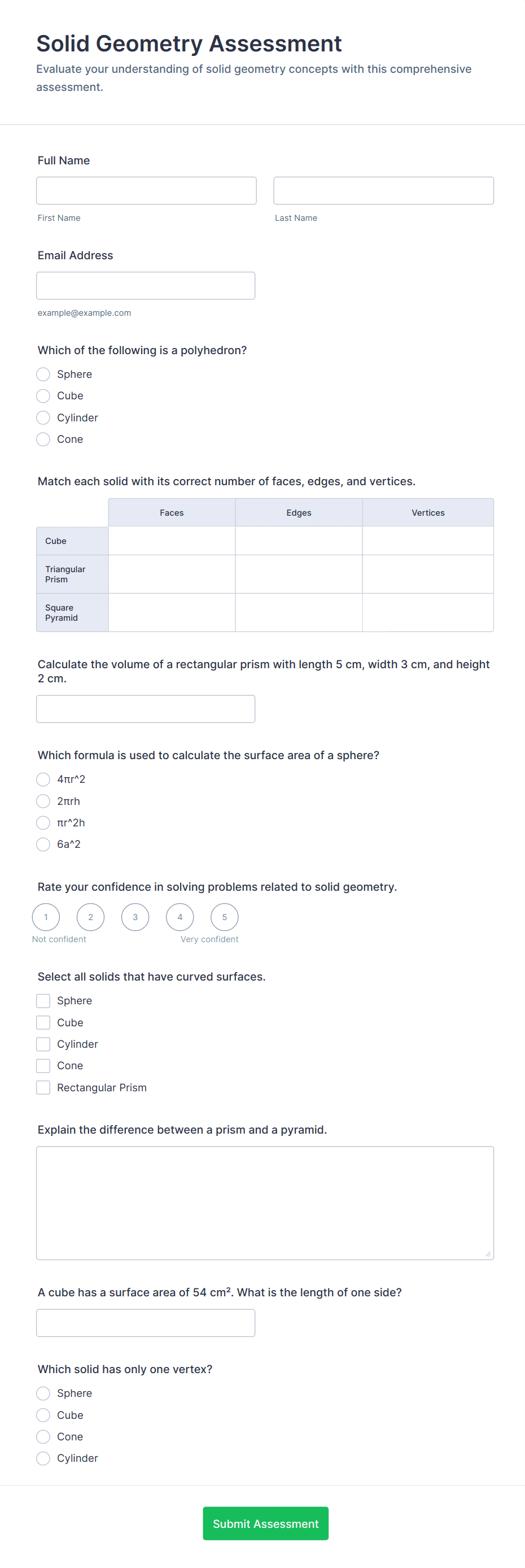 Mathematics Diagnostic Assessment Form helps teachers and tutors evaluate student math readiness and pinpoint learning needs using Jotform form templates for quick online data collection and organized form submission review.