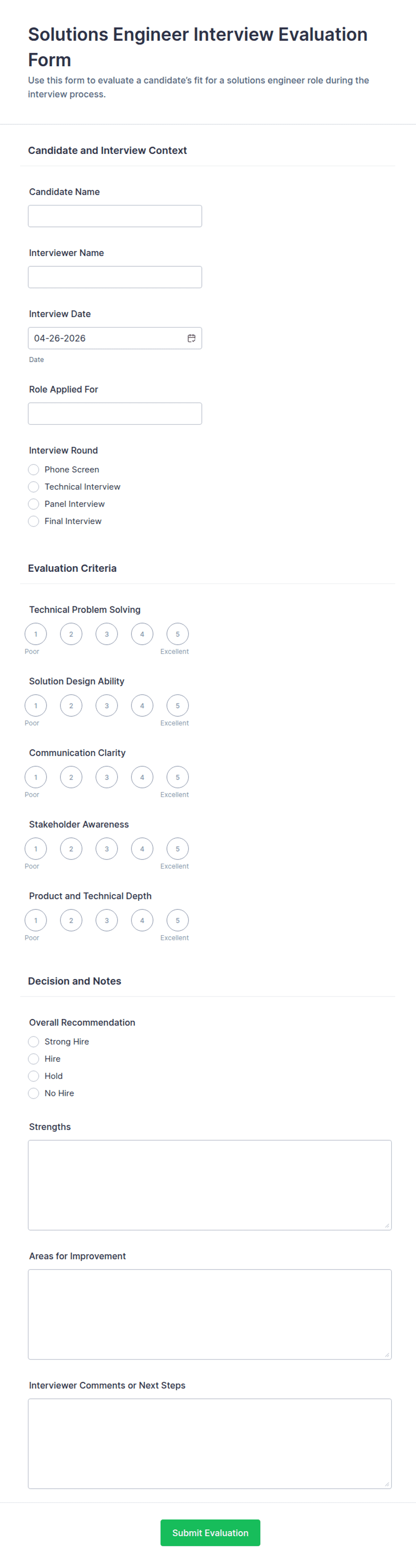 An interview form is a structured document or digital tool used to collect information from individuals during interviews. It standardizes the questions and response formats, ensuring consistency and efficiency in data collection.