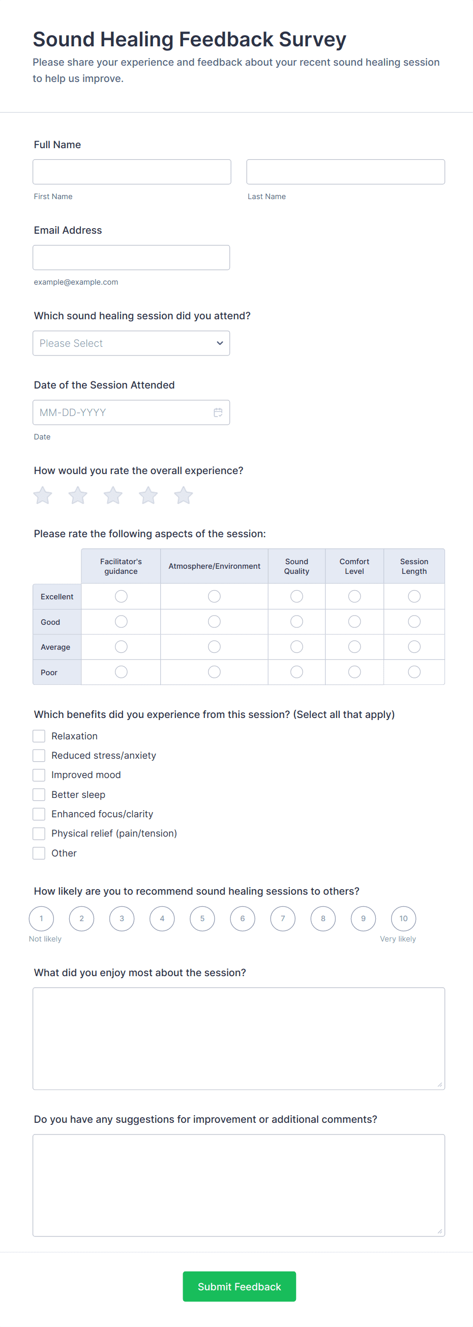 • For event feedback, include ratings for organization, content, and logistics, as well as open-ended suggestions.