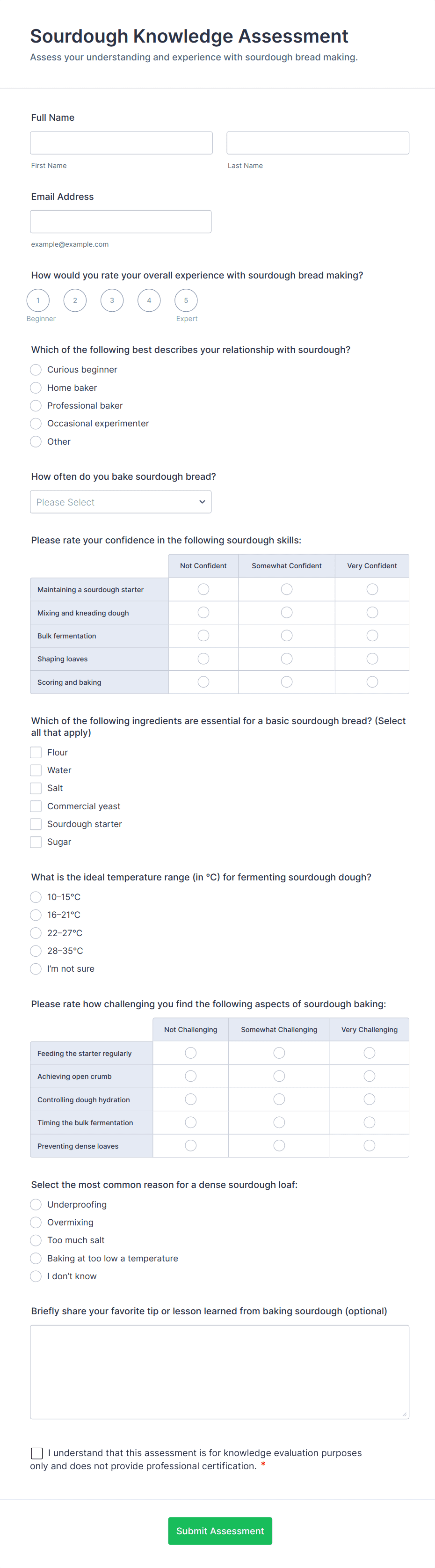 Assessment forms may include personal details, multiple-choice or open-ended questions, rating scales, comment sections, and sometimes automated scoring or feedback fields, depending on the purpose.