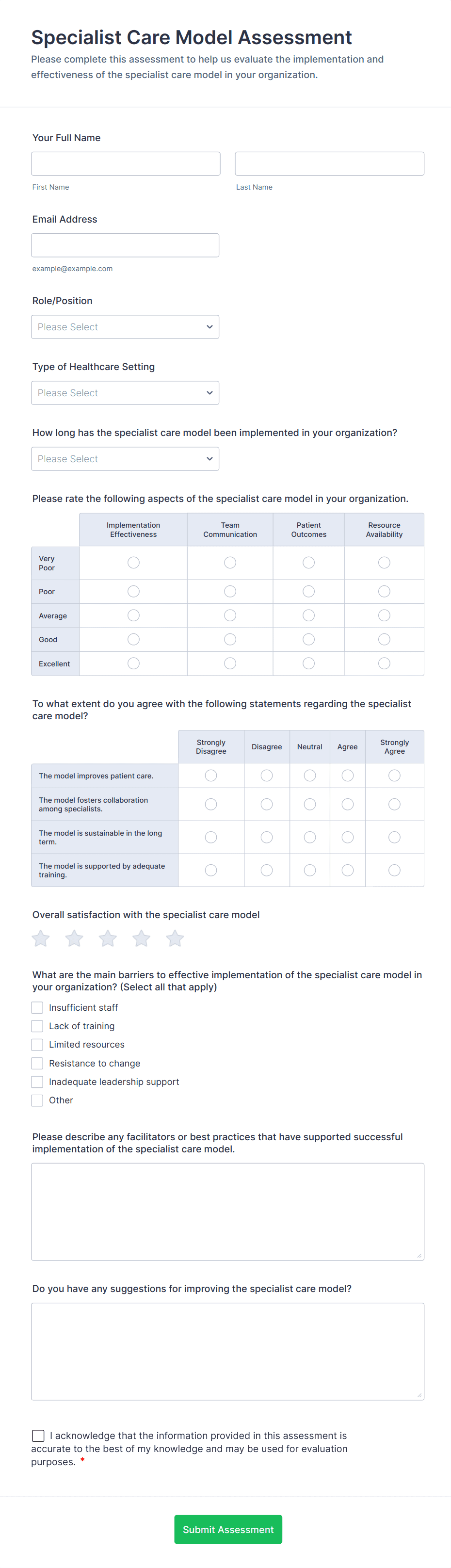 Healthcare assessment forms are structured documents used to collect and evaluate patient health information to support clinical decisions, care planning, and ongoing monitoring. They help healthcare teams capture consistent details about symptoms, medical history, risk factors, functional status, and care needs in a clear and organized way. Healthcare assessment forms are commonly used in clinics, hospitals, telehealth services, rehabilitation centers, home care, and specialty practices for intake assessments, screening evaluations, follow-up check-ins, and condition monitoring. By standardizing assessment workflows, these forms improve documentation quality, reduce missing information, and support safer, more coordinated care.