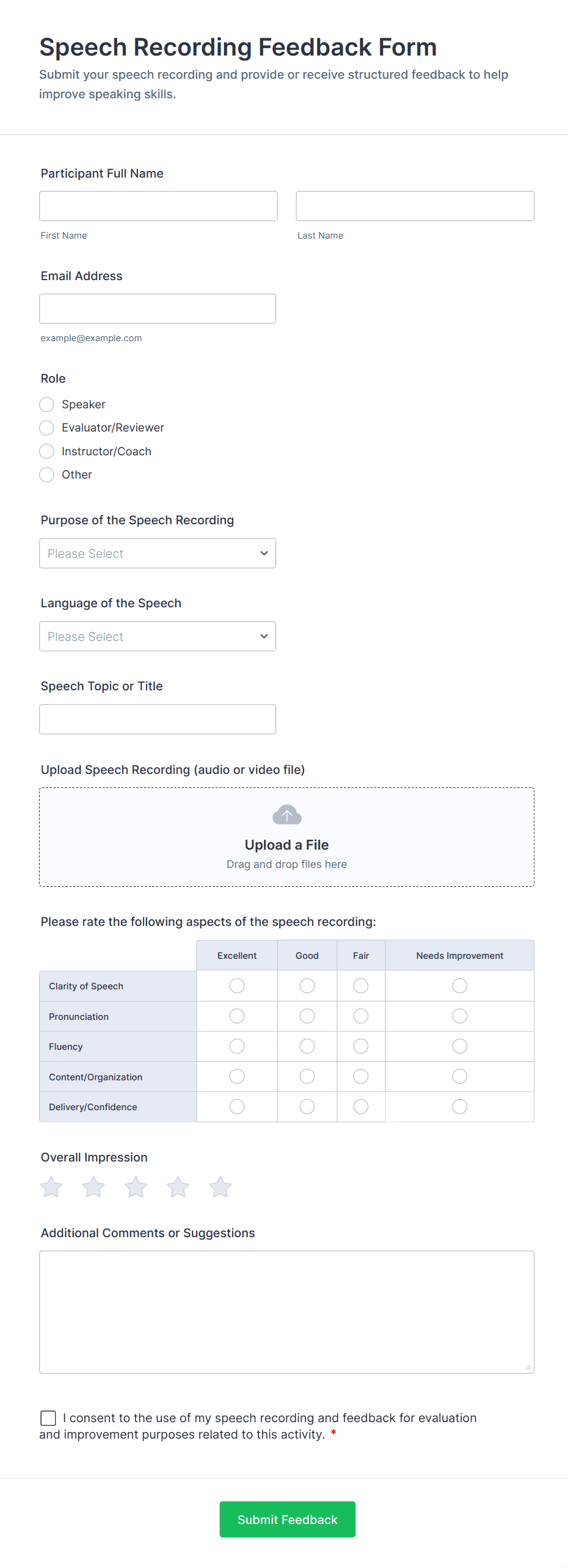 • Use the drag-and-drop Form Builder to add fields relevant to your feedback goals. Common elements include:
