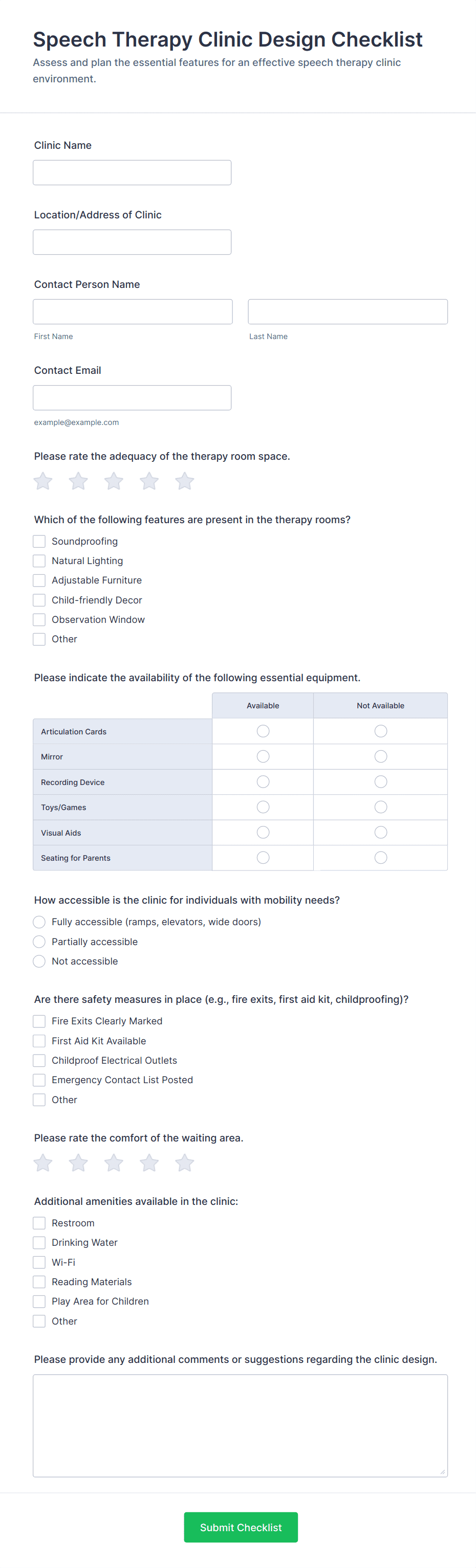• Safety checklists may include fields for location, date, inspector name, and comments