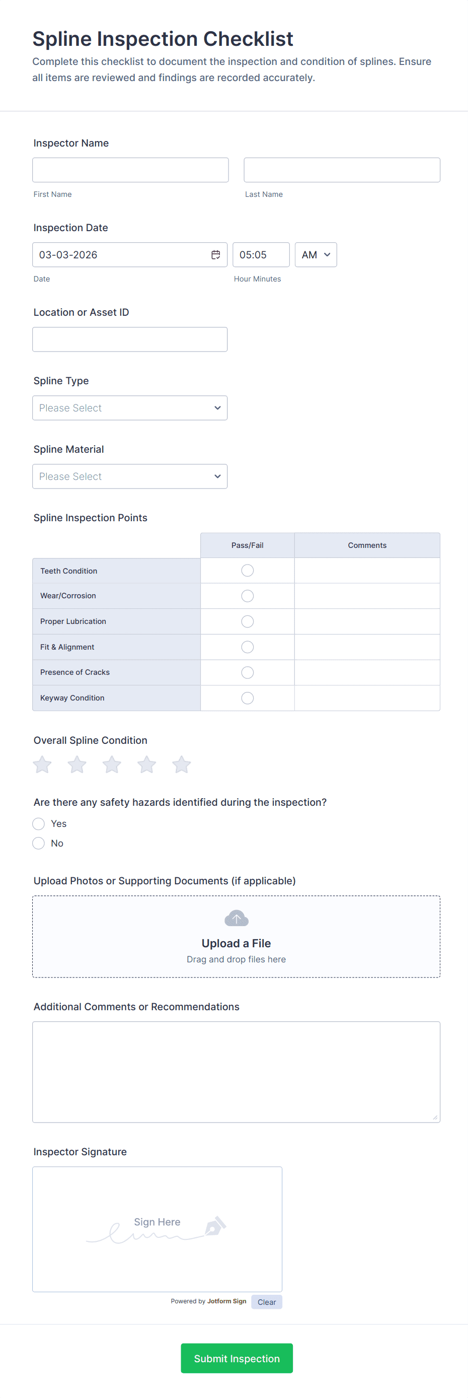 Yes, modern inspection forms—especially digital ones—can include file upload fields for photos and signature fields for verification and accountability.