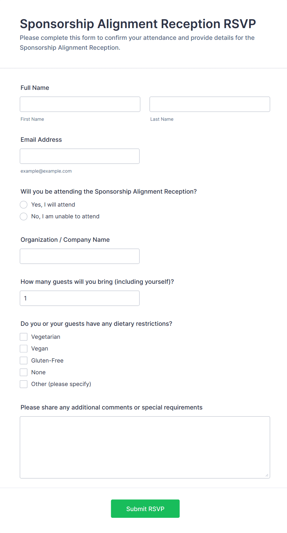 RSVP forms are digital tools designed to collect responses from invitees regarding their attendance at events, gatherings, meetings, or special occasions. Whether you’re organizing a wedding, corporate seminar, birthday party, or community event, RSVP forms streamline the process of confirming guest participation, gathering essential details like meal preferences, plus-ones, or special requirements. These forms help event organizers efficiently manage headcounts, plan logistics, and ensure a smooth experience for both hosts and attendees. The versatility of RSVP forms means they can be tailored for formal galas, casual get-togethers, virtual webinars, or even recurring club meetings.