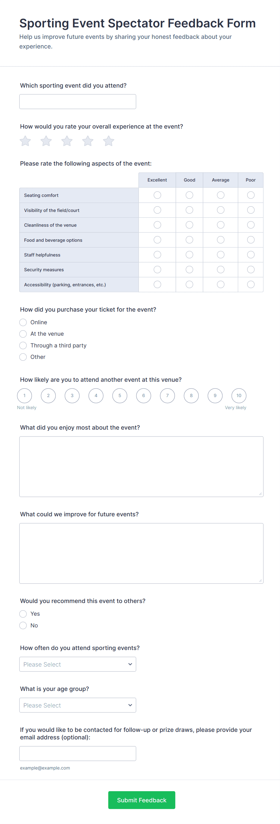 - For virtual events, include questions about technology, accessibility, and online engagement.