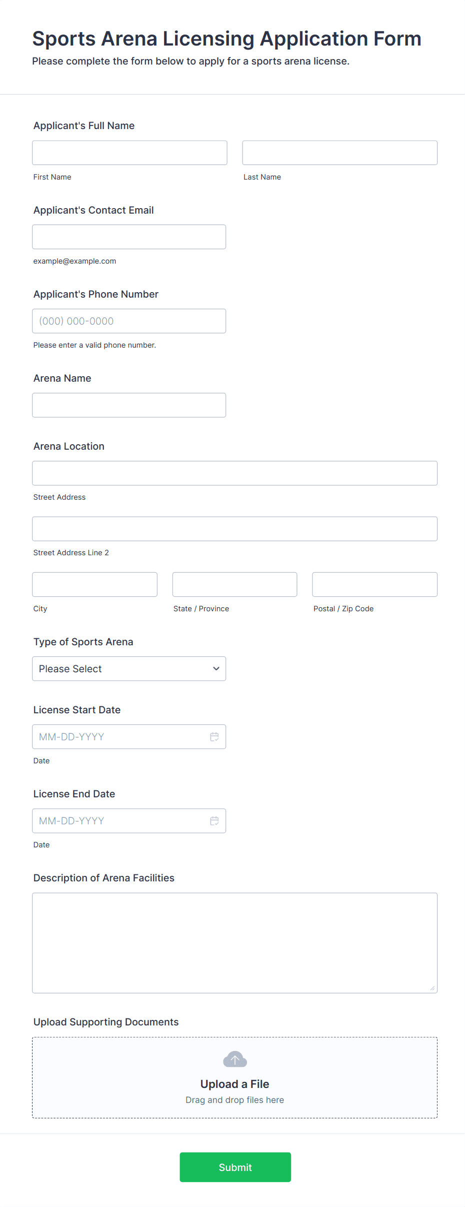 • For job applications, include fields for personal information, education, work experience, references, and file uploads for resumes or cover letters.