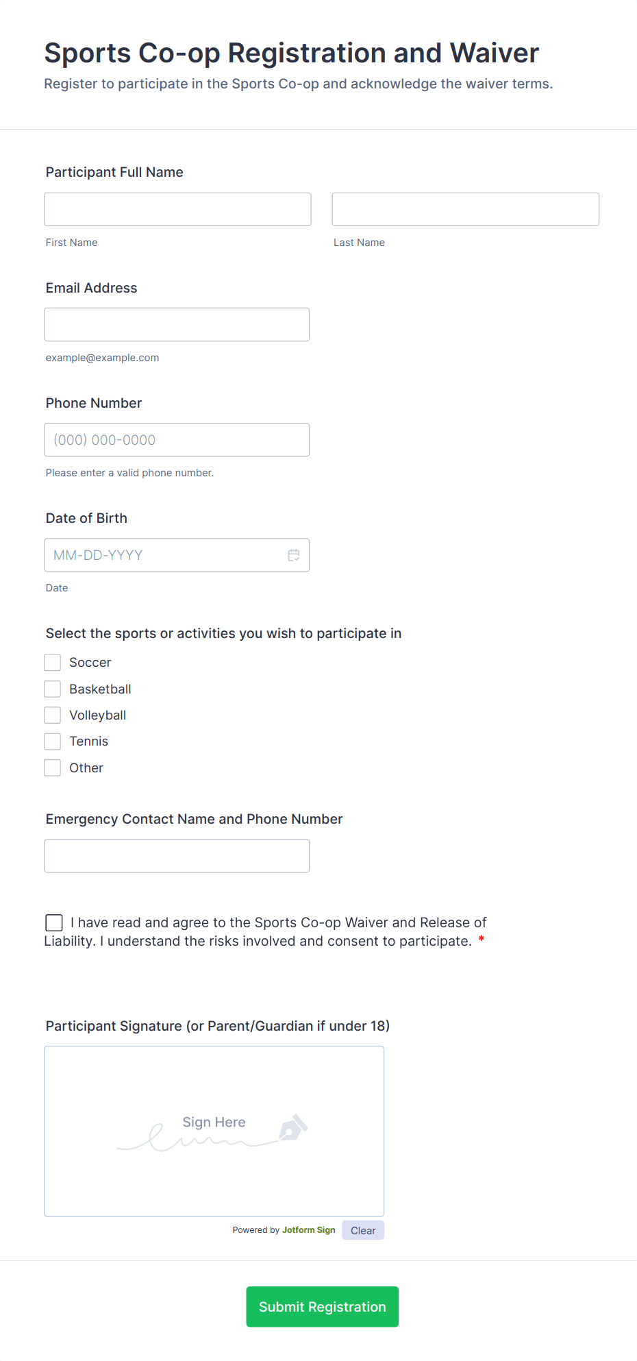 By following these steps, you can create a comprehensive Sports Registration Form that streamlines sign-ups, ensures compliance, and keeps your event organized. Jotform’s no-code builder and robust features make it easy to adapt your form for any sport, age group, or event type, solving common challenges like data collection, payment processing, and communication.