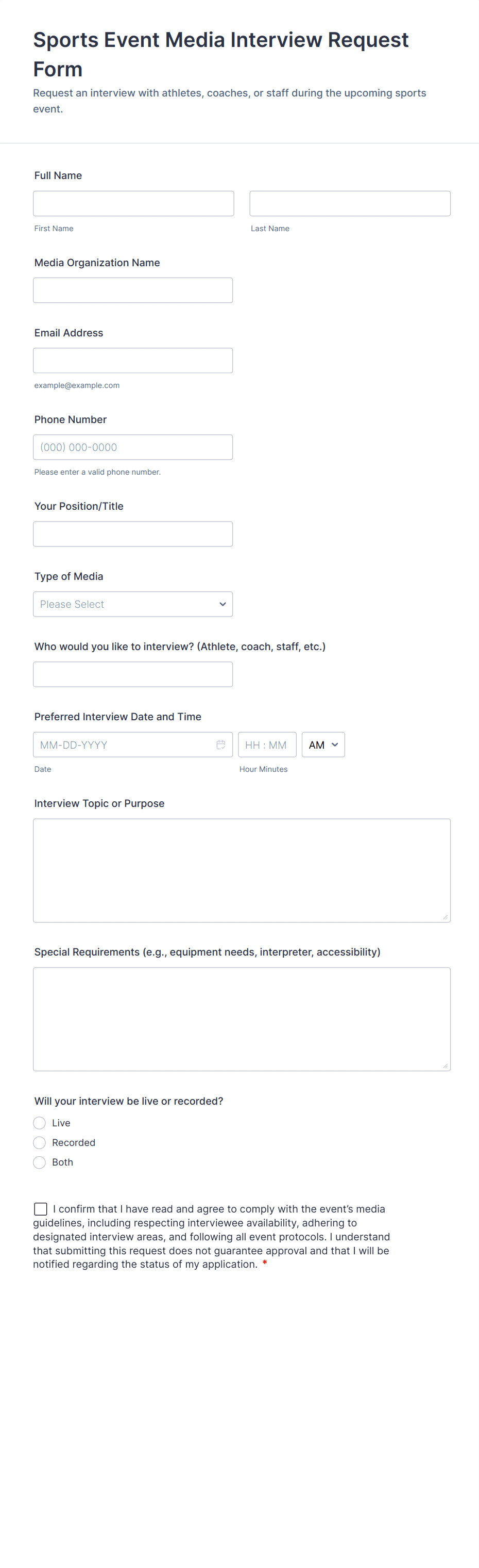 Interview forms are specialized documents or digital tools designed to streamline the process of gathering information from candidates, clients, or stakeholders during interviews. These forms can be used in a variety of settings, such as job interviews, academic research, client intake sessions, or even exit interviews. By standardizing the questions and response formats, interview forms help ensure consistency, fairness, and efficiency in the data collection process. They can include a mix of question types, such as multiple choice, open-ended, rating scales, and more, tailored to the specific goals of the interview.