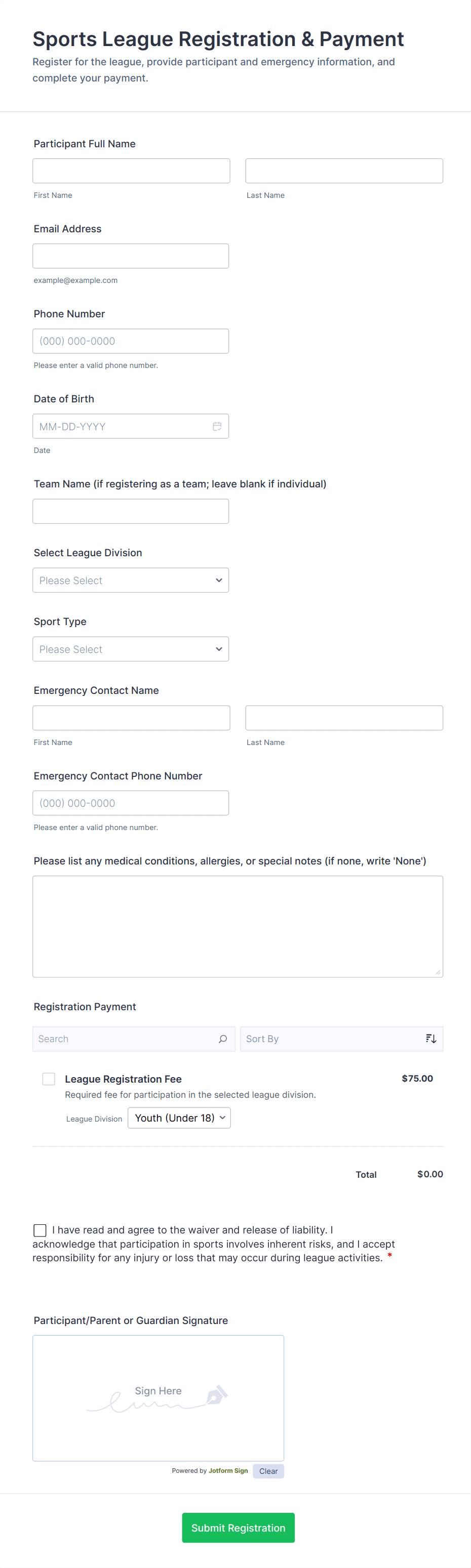 League Registration Form Templates are specialized online forms designed to streamline the process of enrolling teams, players, or participants in various types of leagues—such as sports, e-sports, academic competitions, or community events. These templates help organizers collect essential information like team names, player details, contact information, waivers, and payment details, all in one place. Whether you’re managing a youth soccer league, an adult basketball tournament, or a chess club, these forms can be tailored to fit the unique requirements of your event, making registration efficient and organized.