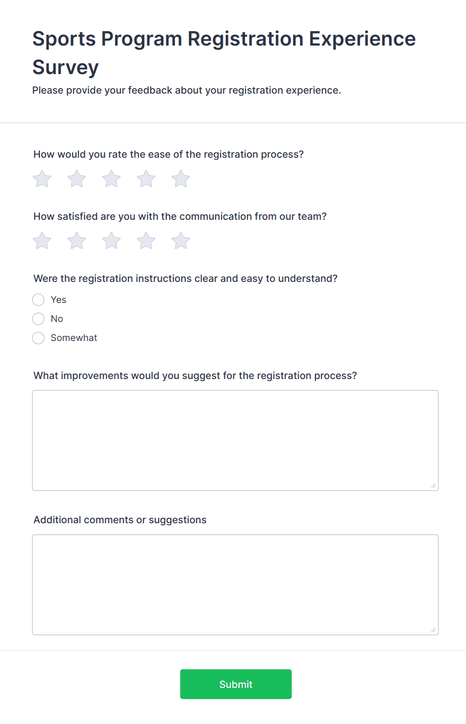 Survey templates are pre-designed forms that help individuals and organizations collect feedback, opinions, or data from a target audience. These templates are widely used for a variety of purposes, such as customer satisfaction surveys, employee engagement assessments, market research, event feedback, and academic studies. By providing a structured set of questions, survey templates streamline the process of gathering valuable insights, making it easier to analyze trends, measure satisfaction, and make informed decisions. Whether you’re a business owner, HR professional, educator, or researcher, survey templates offer a quick and effective way to reach your audience and collect actionable information.