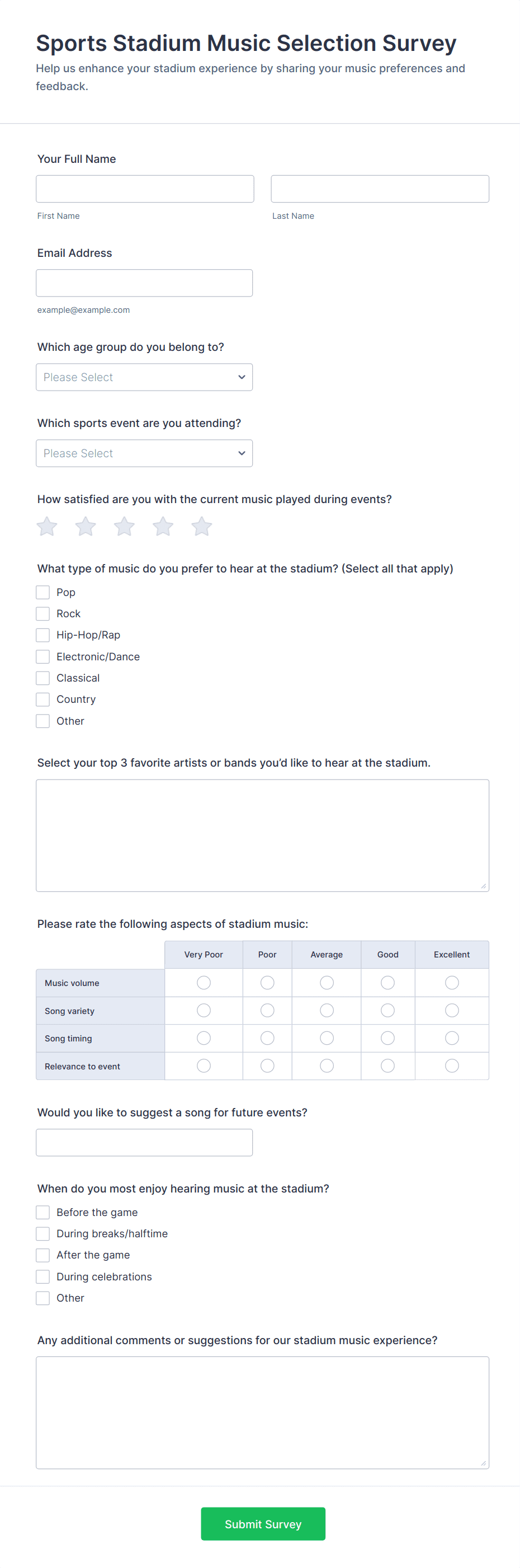 • Content and fields vary by use case: customer surveys may focus on satisfaction and likelihood to recommend, while employee surveys might include questions about workplace culture and management.