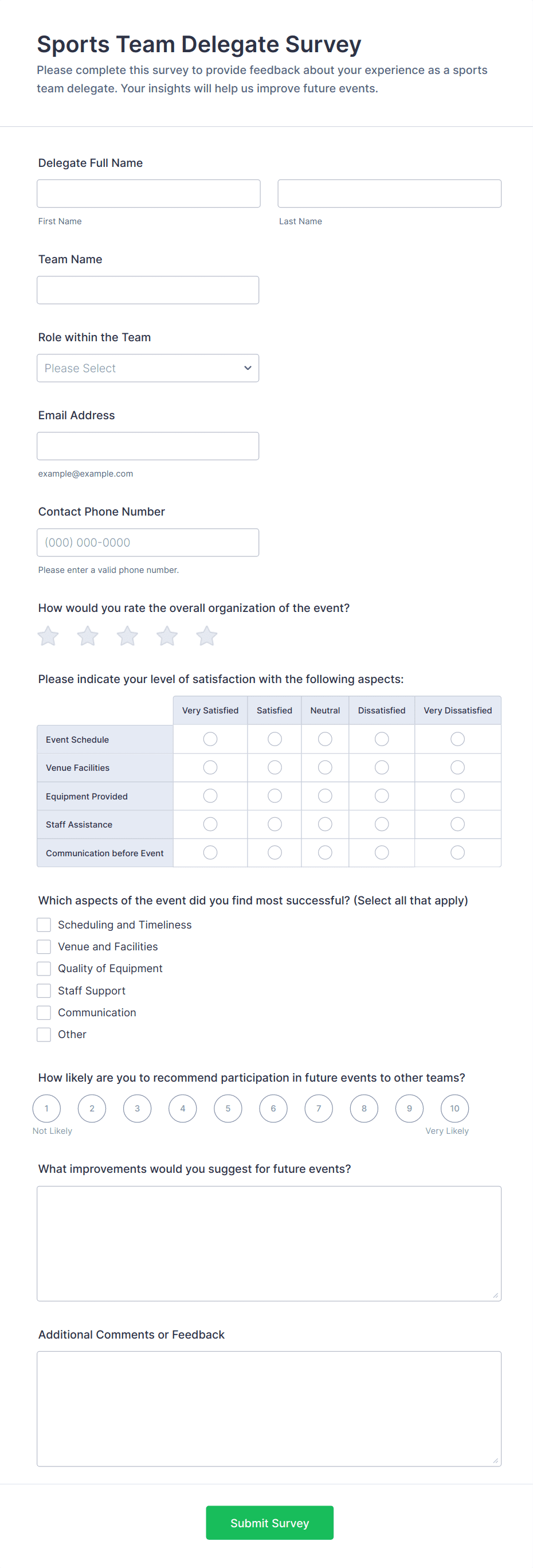 - For virtual events, include questions about technology, accessibility, and online engagement.