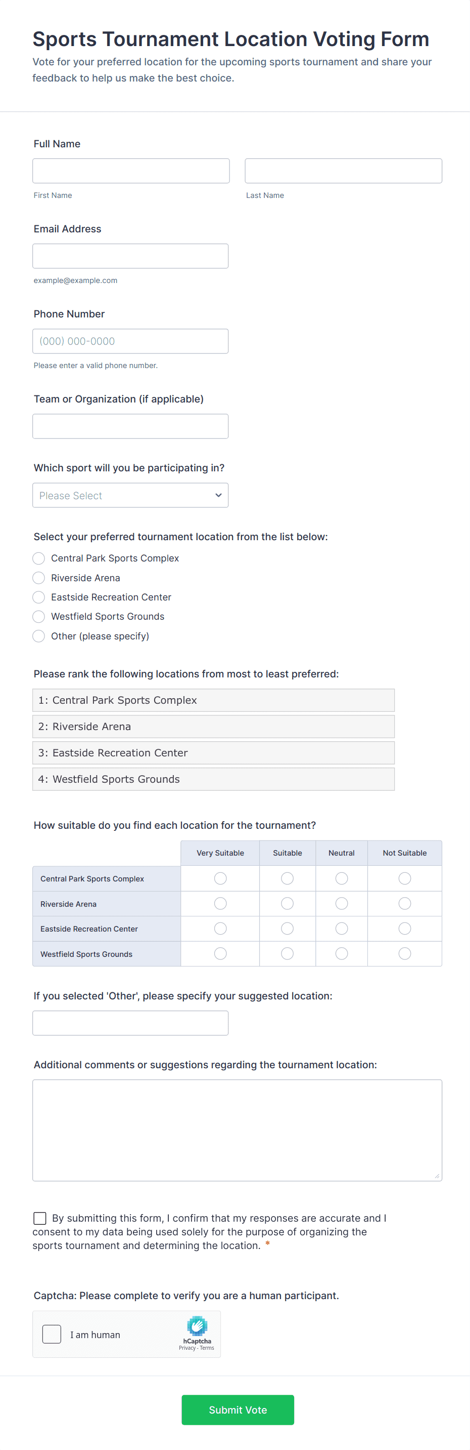 Voting forms are digital tools designed to collect, organize, and analyze votes or preferences from a group of participants. They are commonly used for elections, polls, surveys, award nominations, event planning, and decision-making processes in organizations, schools, clubs, and communities. Voting forms streamline the process of gathering input, whether it’s for selecting a new team leader, choosing a favorite project, or making group decisions efficiently. Their versatility makes them suitable for both formal elections and informal opinion polls, ensuring that every participant’s voice is heard and recorded accurately.