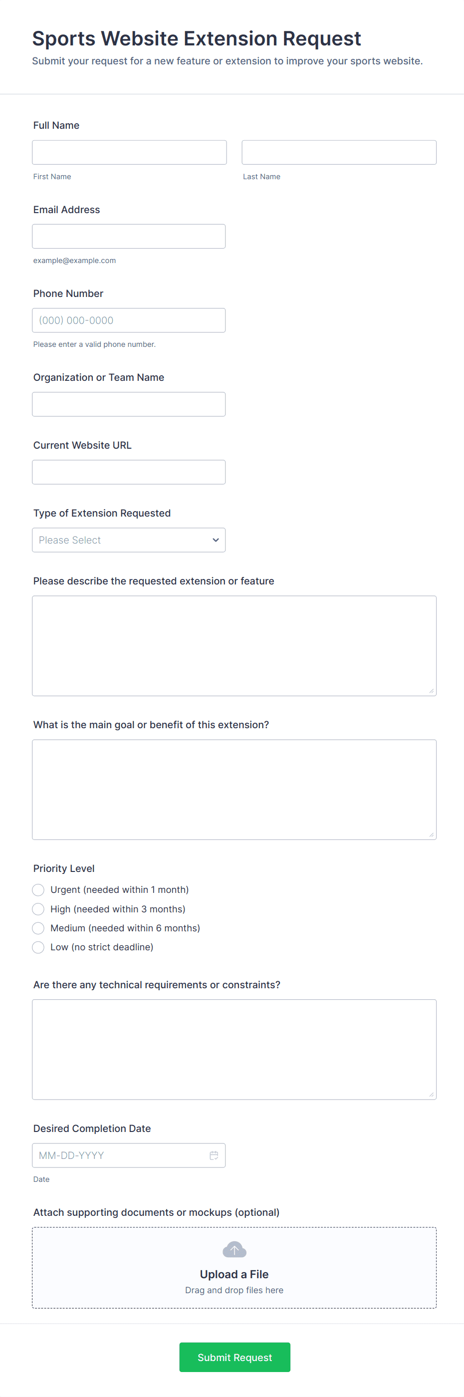 Common fields include requester’s name, contact details, department, type of request, detailed description, urgency, and any relevant attachments.