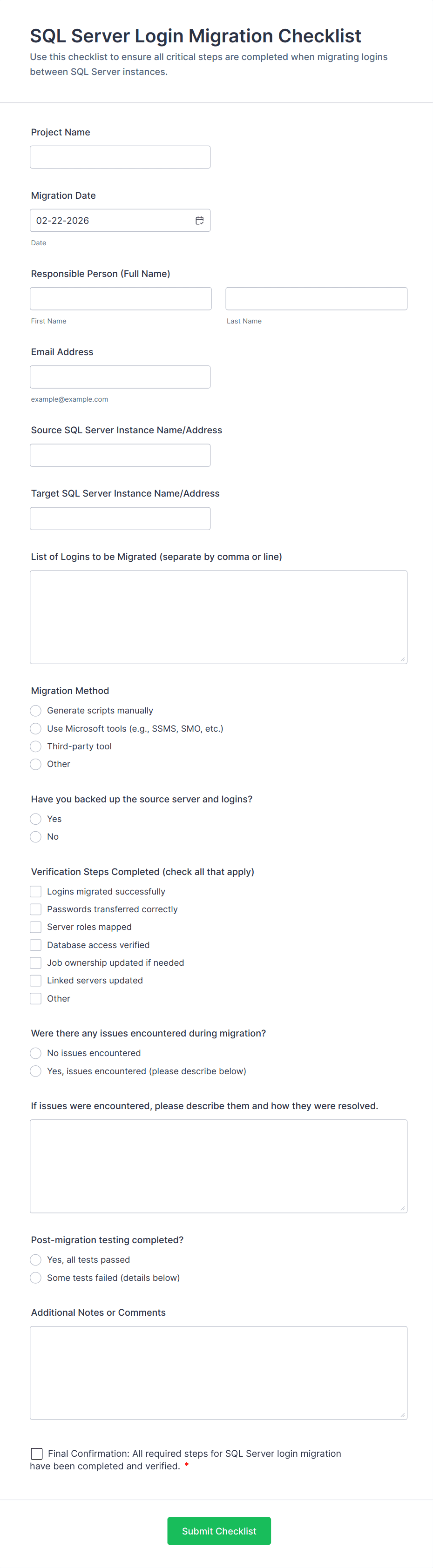 Checklist forms usually contain a list of tasks or items, checkboxes for completion, and may include fields for names, dates, comments, signatures, or supporting documentation.