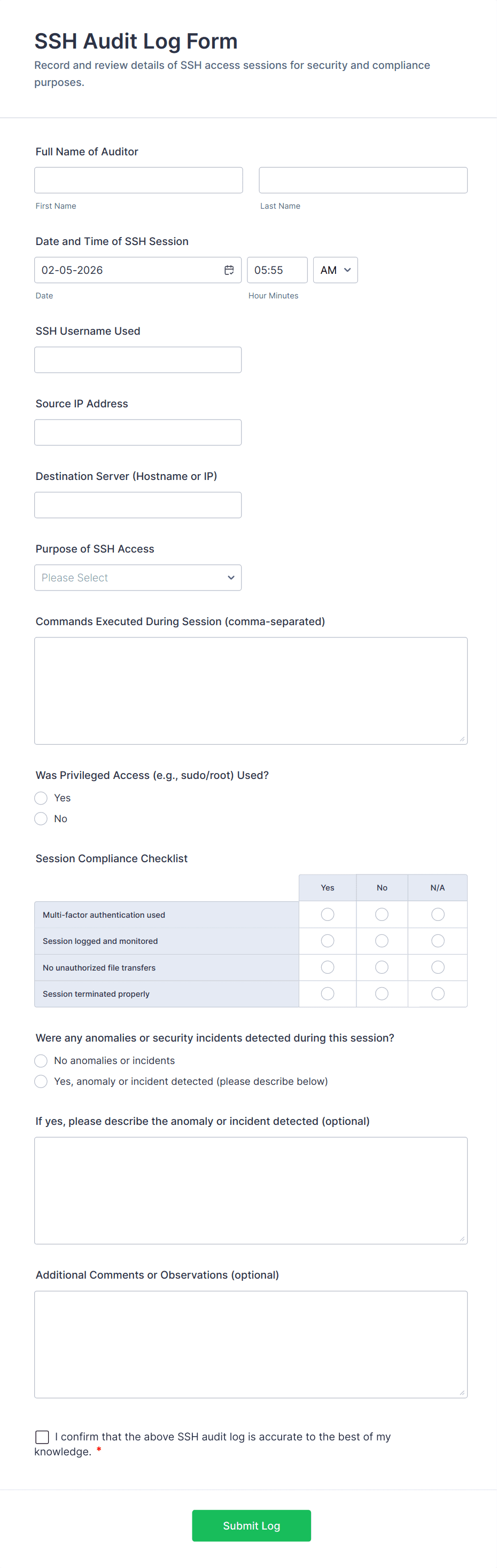 • Compliance Audits: Require fields for regulatory references, evidence collection, and sign-off sections.