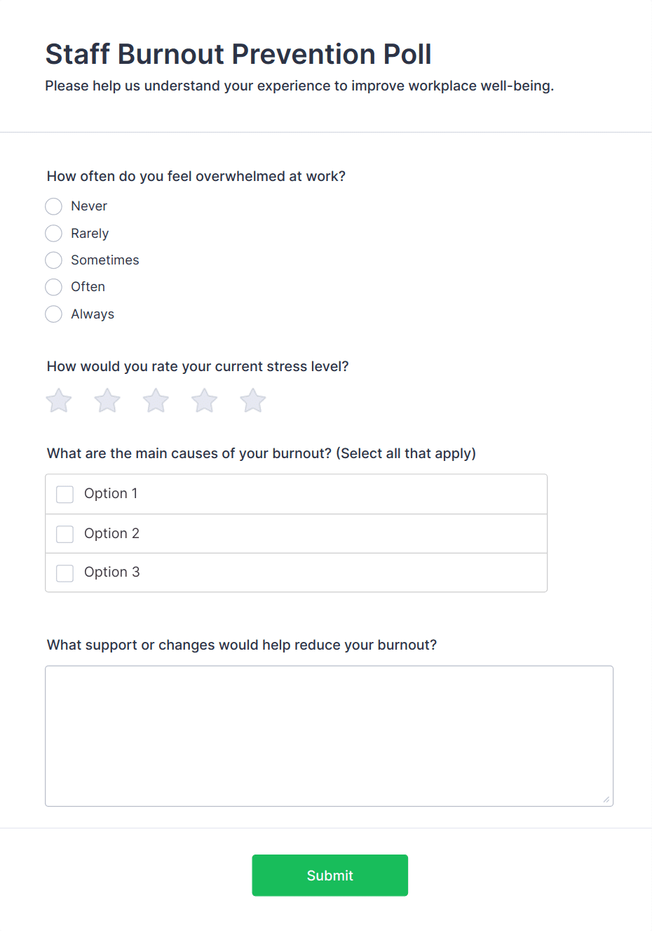 A healthcare employee satisfaction survey is a questionnaire used by managers to take the pulse of the workplace. Easy to use. No coding.