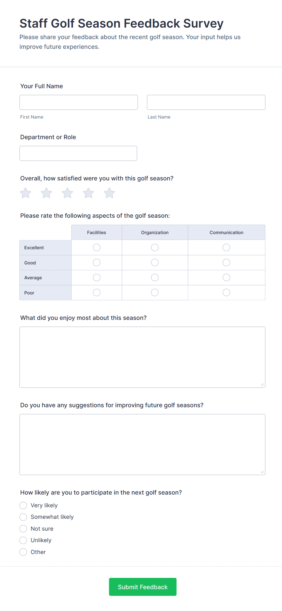 • Event Feedback Surveys: Evaluate attendee satisfaction and gather suggestions for future events.