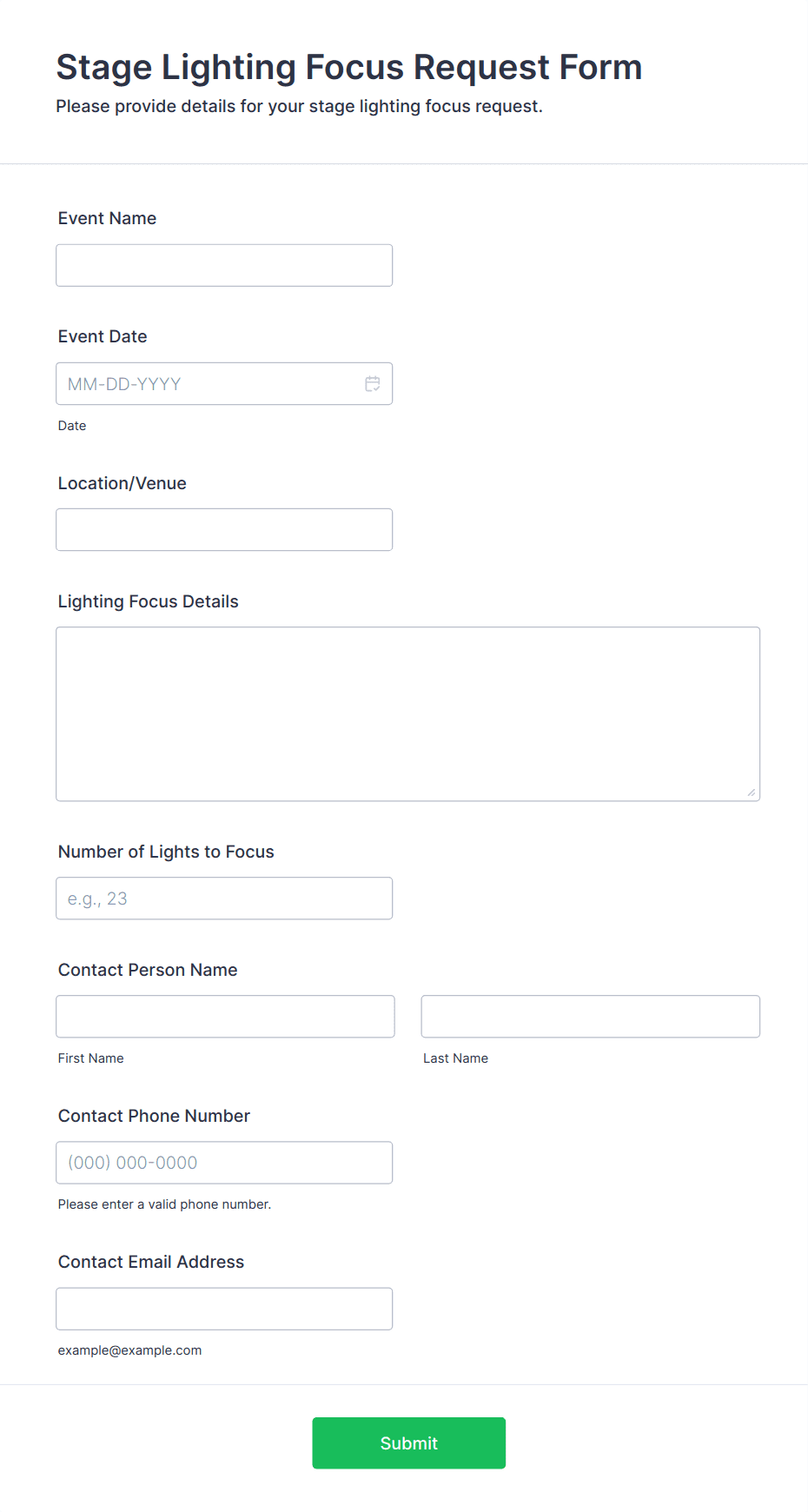 Entertainment Forms are specialized online forms designed to streamline processes within the entertainment industry, including event planning, talent management, audience engagement, and more. These forms can be used for a variety of purposes such as event registrations, ticket bookings, talent auditions, feedback collection, contest entries, and guest list management. Whether you’re organizing a concert, managing a film festival, running a comedy show, or hosting a virtual gaming tournament, Entertainment Forms help you efficiently gather and manage information from participants, attendees, and staff.