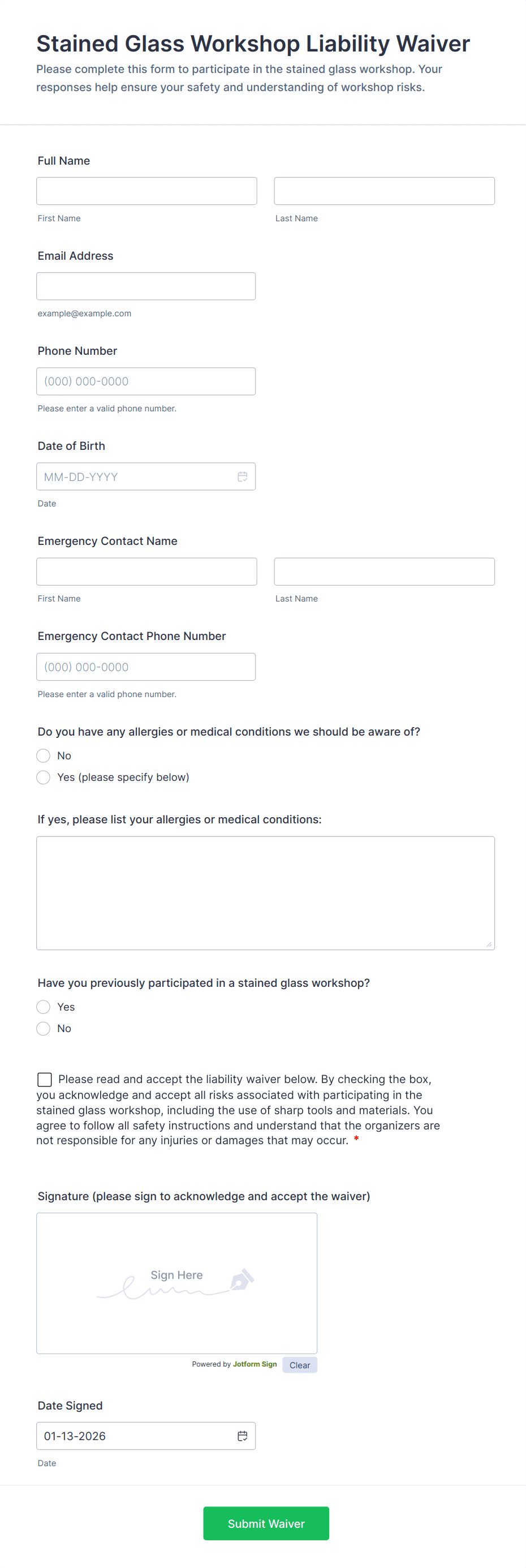The form templates here are for informational purposes only. Jotform is not providing legal, financial, or other advice, or implying that the forms are legally valid in all or any jurisdictions. Before using any such form, consult an attorney and/or other applicable professionals to make sure that the form meets your needs, legally and otherwise.