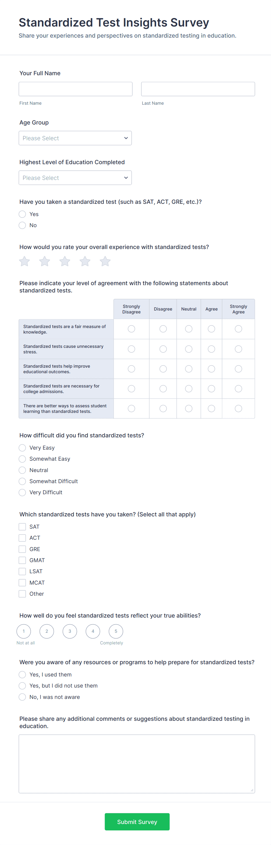 An education survey is a questionnaire designed to collect feedback, opinions, or data from students, teachers, parents, or staff about various aspects of the educational experience, such as courses, teaching methods, school climate, or program effectiveness.