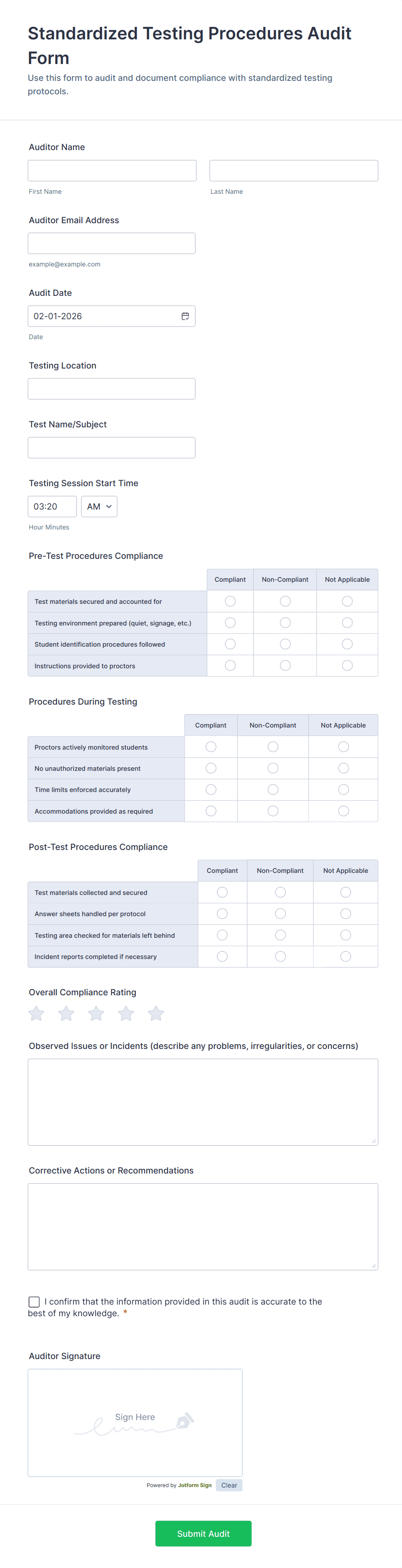 Jotform ensures that all form submissions are securely stored and can be accessed only by authorized users. Additional privacy features, such as encryption and access controls, help protect sensitive audit data.