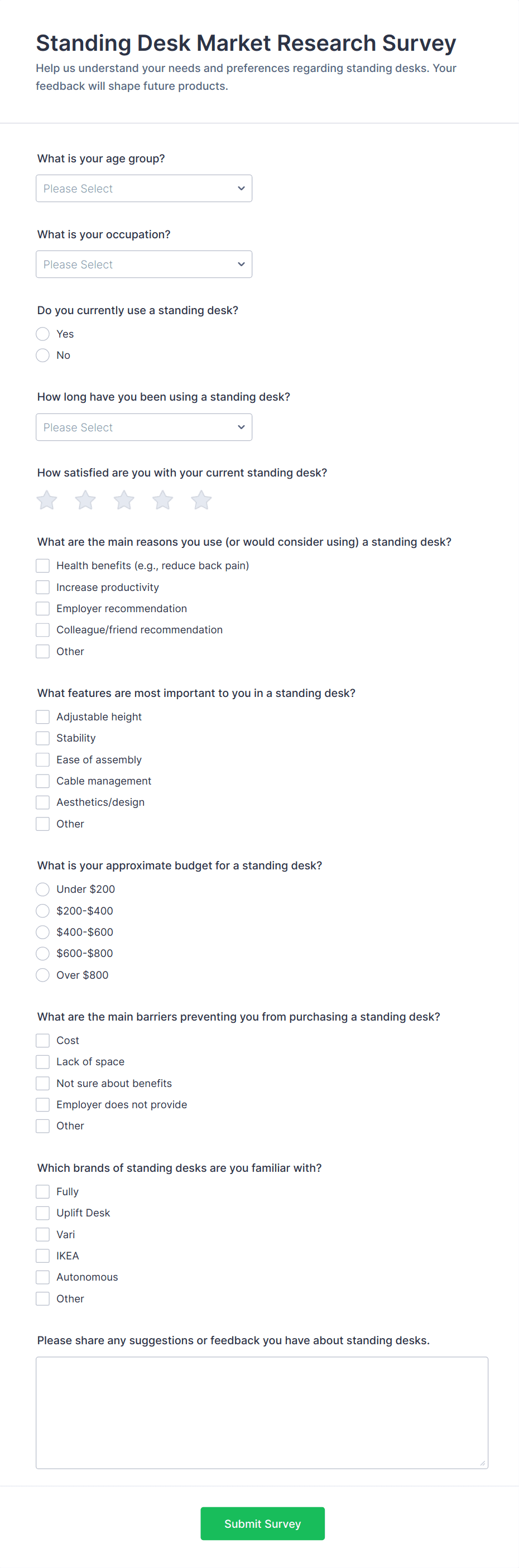 Product Survey Templates are pre-designed forms specifically created to help businesses, product managers, marketers, and researchers gather valuable feedback about products from customers, users, or stakeholders. These templates are used to assess customer satisfaction, collect suggestions for improvement, evaluate product features, and understand user experiences. Product survey forms can be utilized at various stages of a product’s lifecycle — from initial concept testing and beta launches to post-purchase feedback and ongoing product improvement. Common use cases include new product feedback, feature prioritization, usability testing, and post-launch satisfaction surveys.
