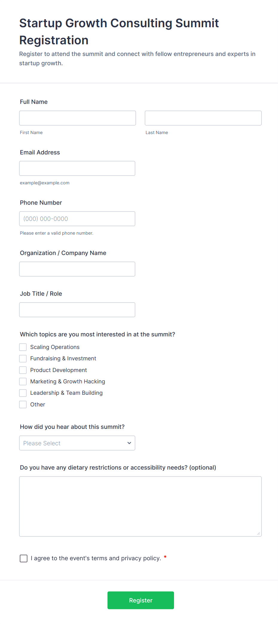 A Summit Registration Form is a simple, customizable tool that streamlines event registrations, boosting attendance rates. It not only eases the process for attendees but also helps organizers manage participant data effortlessly.