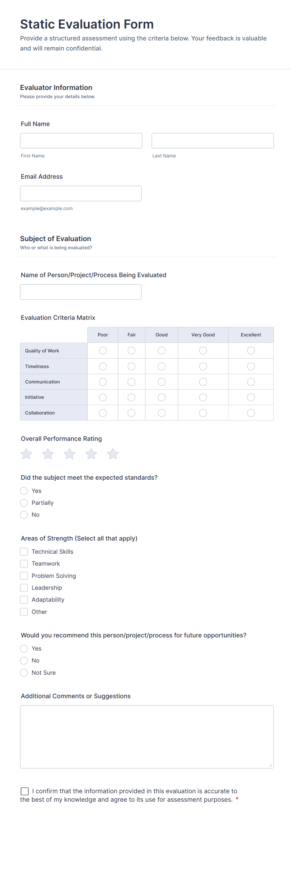 An evaluation form is a structured document or online tool used to collect feedback, assess performance, or measure satisfaction in various settings such as workplaces, schools, events, or customer interactions.
