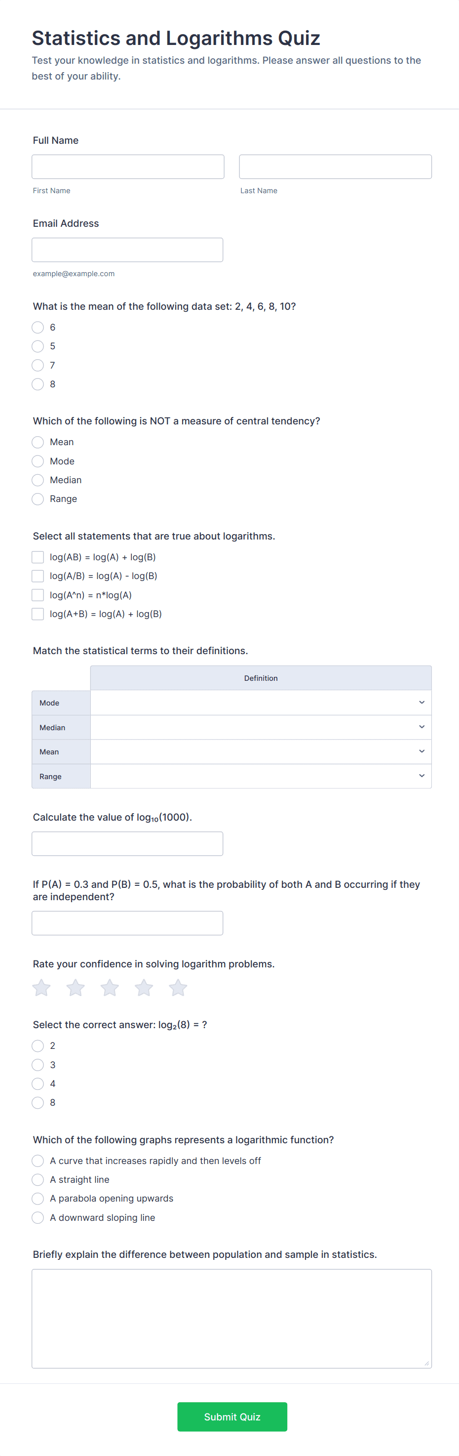 Quiz Templates are pre-designed forms specifically created to facilitate the process of building quizzes for a variety of purposes, such as education, employee training, lead generation, event engagement, and more. These templates provide a structured way to present questions, collect answers, and automatically score or evaluate responses. Whether you’re a teacher assessing student knowledge, a business running a product knowledge test, or a marketer creating a fun personality quiz, Quiz Templates offer a flexible foundation to suit your needs. They can be used for online exams, trivia games, onboarding assessments, customer feedback quizzes, and interactive learning modules.