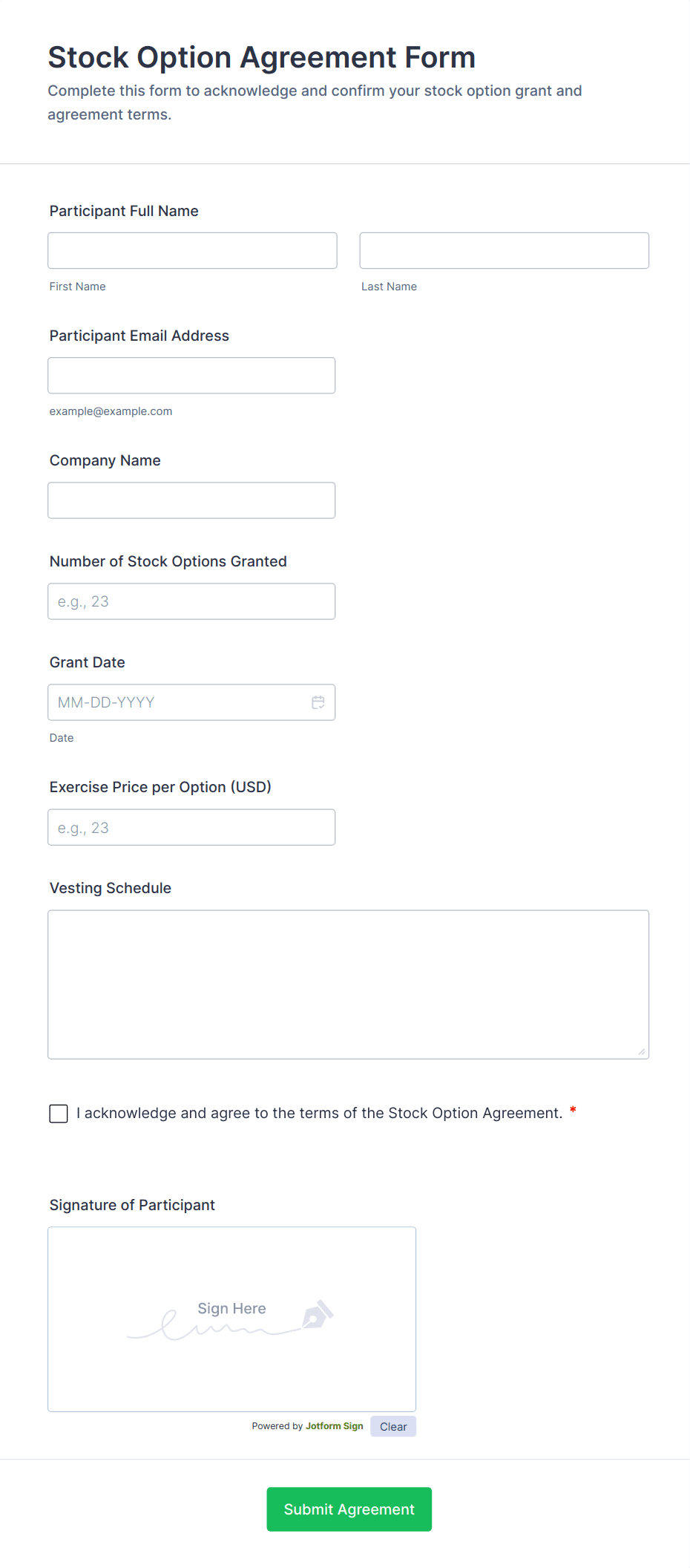 The form templates here are for informational purposes only. Jotform is not providing legal, financial, or other advice, or implying that the forms are legally valid in all or any jurisdictions. Before using any such form, consult an attorney and/or other applicable professionals to make sure that the form meets your needs, legally and otherwise.