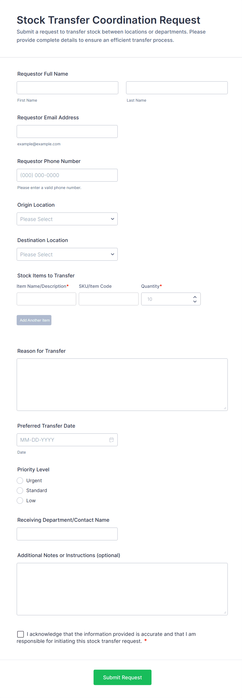 Request forms are essential tools for gathering and organizing information when someone needs to ask for something — whether it’s a service, resource, approval, or support. These forms streamline the process of submitting and managing requests in a wide range of scenarios, such as equipment requests, maintenance requests, time-off requests, IT support, purchase orders, facility bookings, and more. By providing a standardized way to collect all necessary details, request forms help organizations ensure that every request is clear, trackable, and actionable, reducing miscommunication and delays.