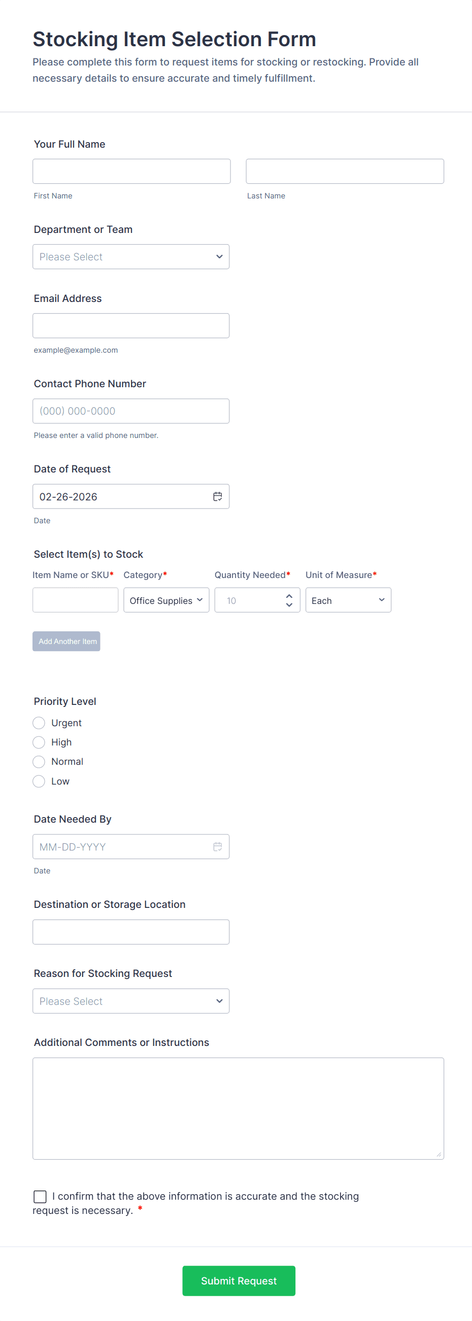 • For inventory restocking, integrate fields for SKU numbers and reorder levels.