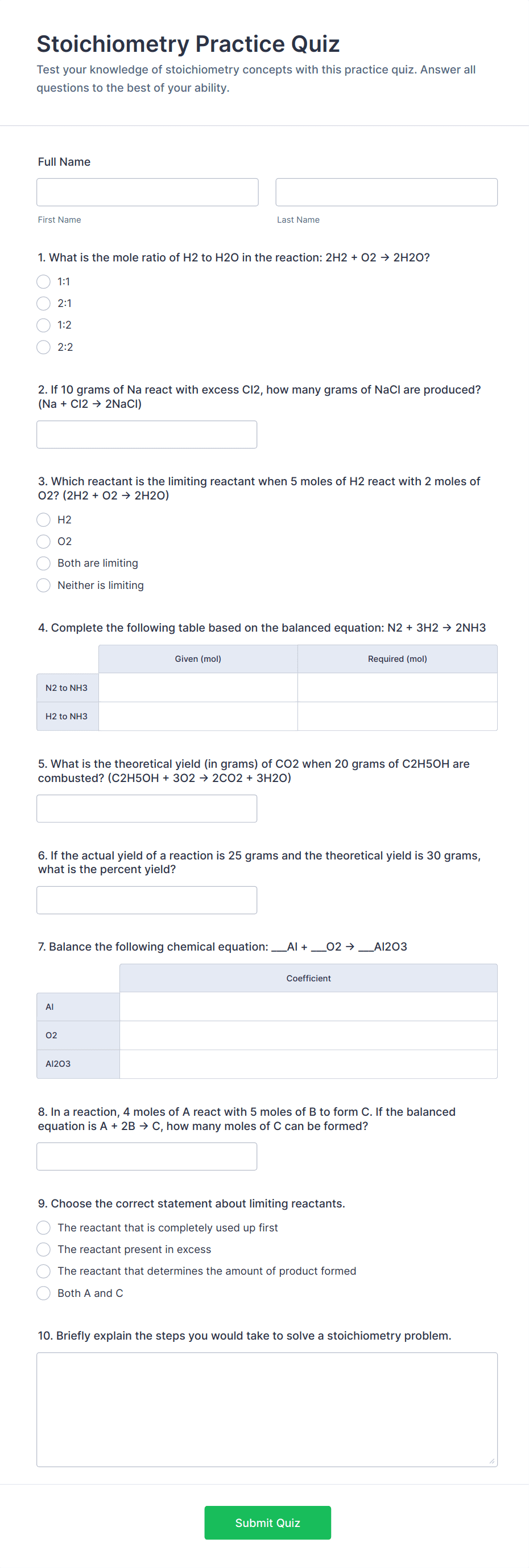 Quiz Templates are pre-designed forms specifically created to facilitate the process of building quizzes for a variety of purposes, such as education, employee training, lead generation, event engagement, and more. These templates provide a structured way to present questions, collect answers, and automatically score or evaluate responses. Whether you’re a teacher assessing student knowledge, a business running a product knowledge test, or a marketer creating a fun personality quiz, Quiz Templates offer a flexible foundation to suit your needs. They can be used for online exams, trivia games, onboarding assessments, customer feedback quizzes, and interactive learning modules.