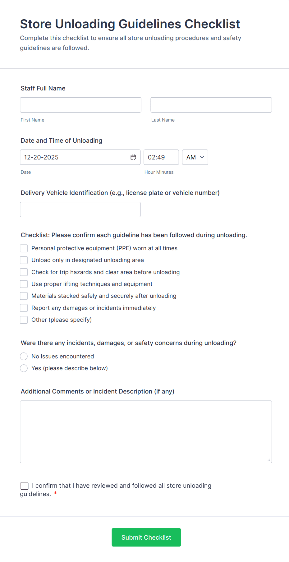 Common fields include item name, SKU or barcode, quantity, date/time, staff or requester details, and notes on condition or discrepancies.