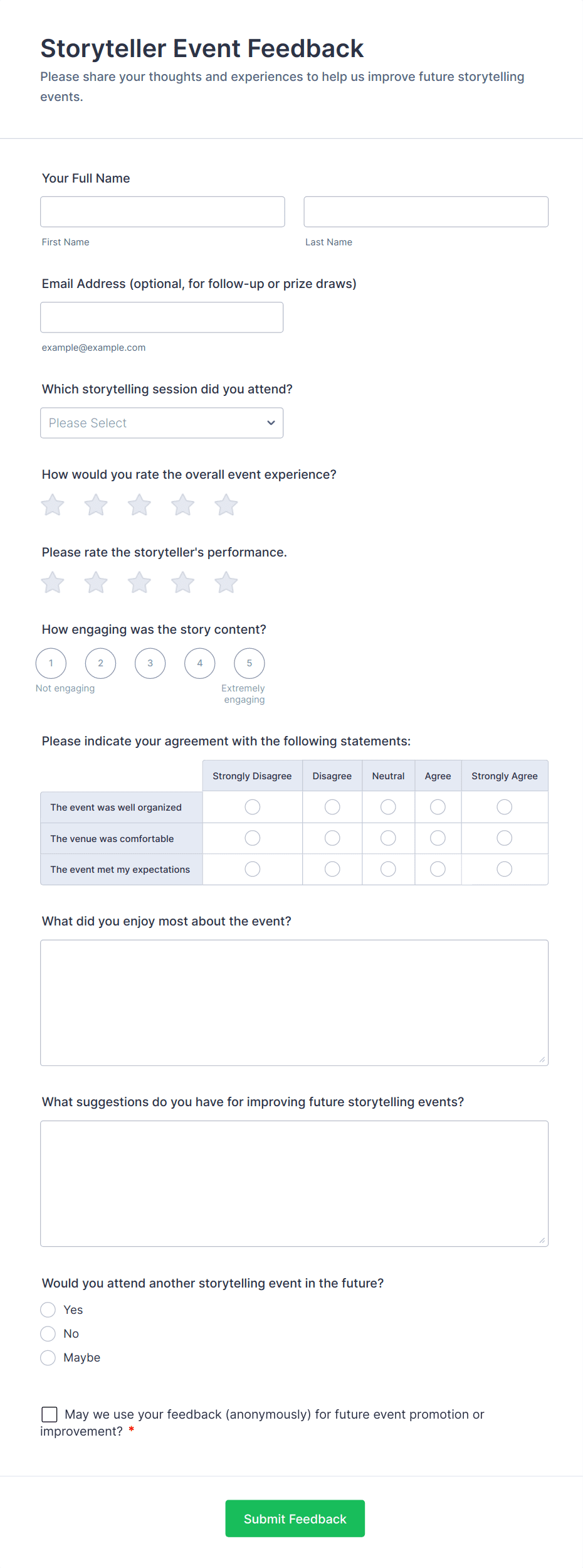 Event Feedback Forms are versatile and can be adapted to suit a variety of event types and organizational needs. Their primary function is to help event organizers gather honest, actionable feedback to improve future events and measure attendee satisfaction. Here’s how they can be used in different scenarios: