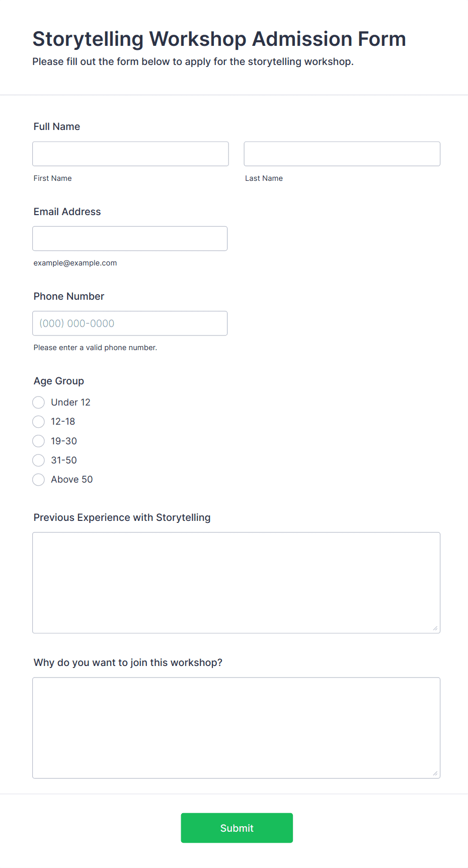 Youth Interactive Workshop Registration Form is a customizable template for schools and youth organizations to collect participant details and streamline workshop signups efficiently.