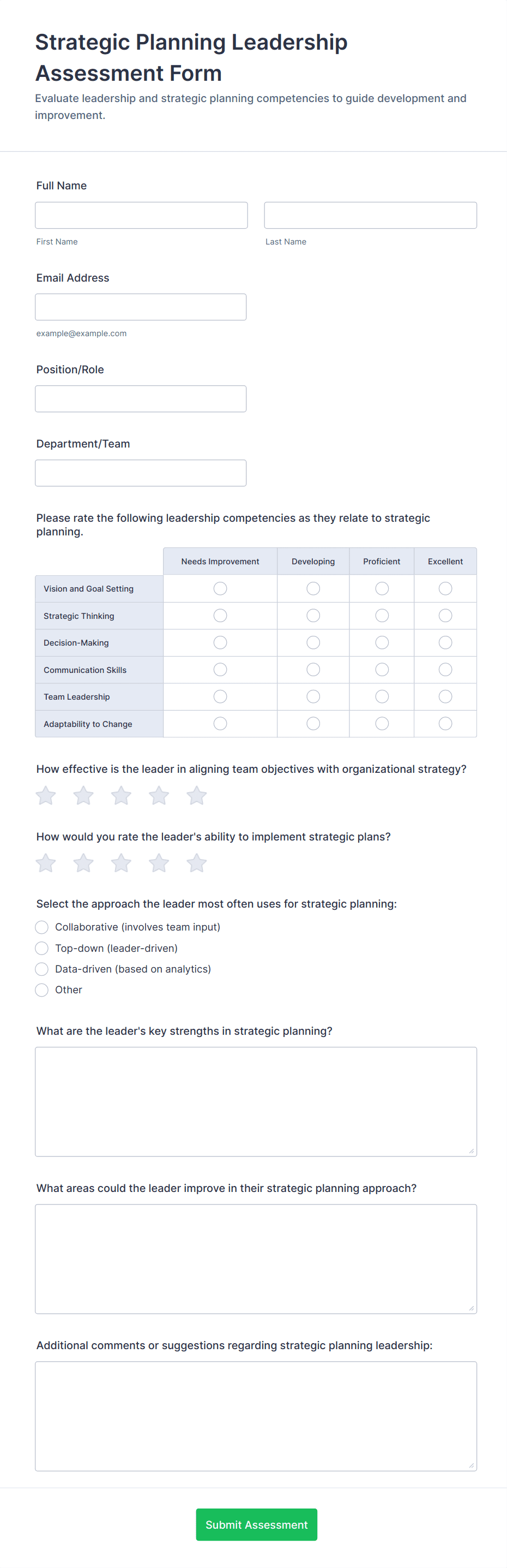 Assessment Form Templates are pre-designed digital forms used to evaluate, measure, or analyze knowledge, skills, performance, or other criteria across a variety of settings. These templates are commonly utilized in education for student assessments, in the workplace for employee evaluations, in healthcare for patient screenings, and in many other fields where structured feedback or data collection is essential. Assessment forms can range from simple quizzes and self-assessments to complex multi-section evaluations, making them versatile tools for gathering actionable insights and supporting decision-making processes.