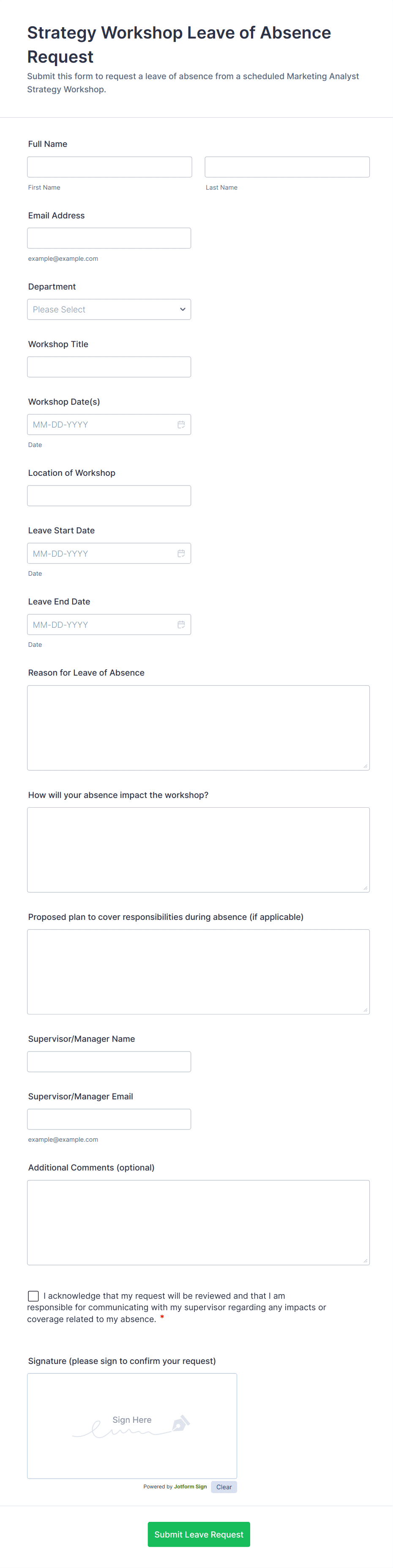 The template allows getting instant leave requests from employees with all relevant information that is needed. You can add more customized fields with Jotform.