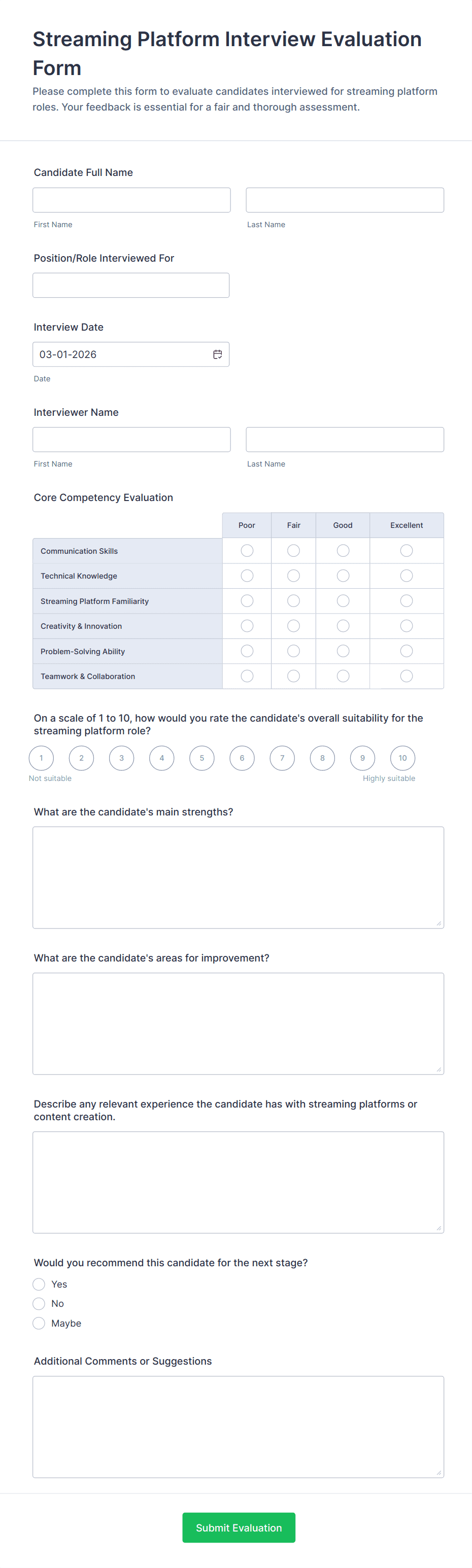 An interview form is a structured document or digital tool used to collect information from individuals during interviews. It standardizes the questions and response formats, ensuring consistency and efficiency in data collection.