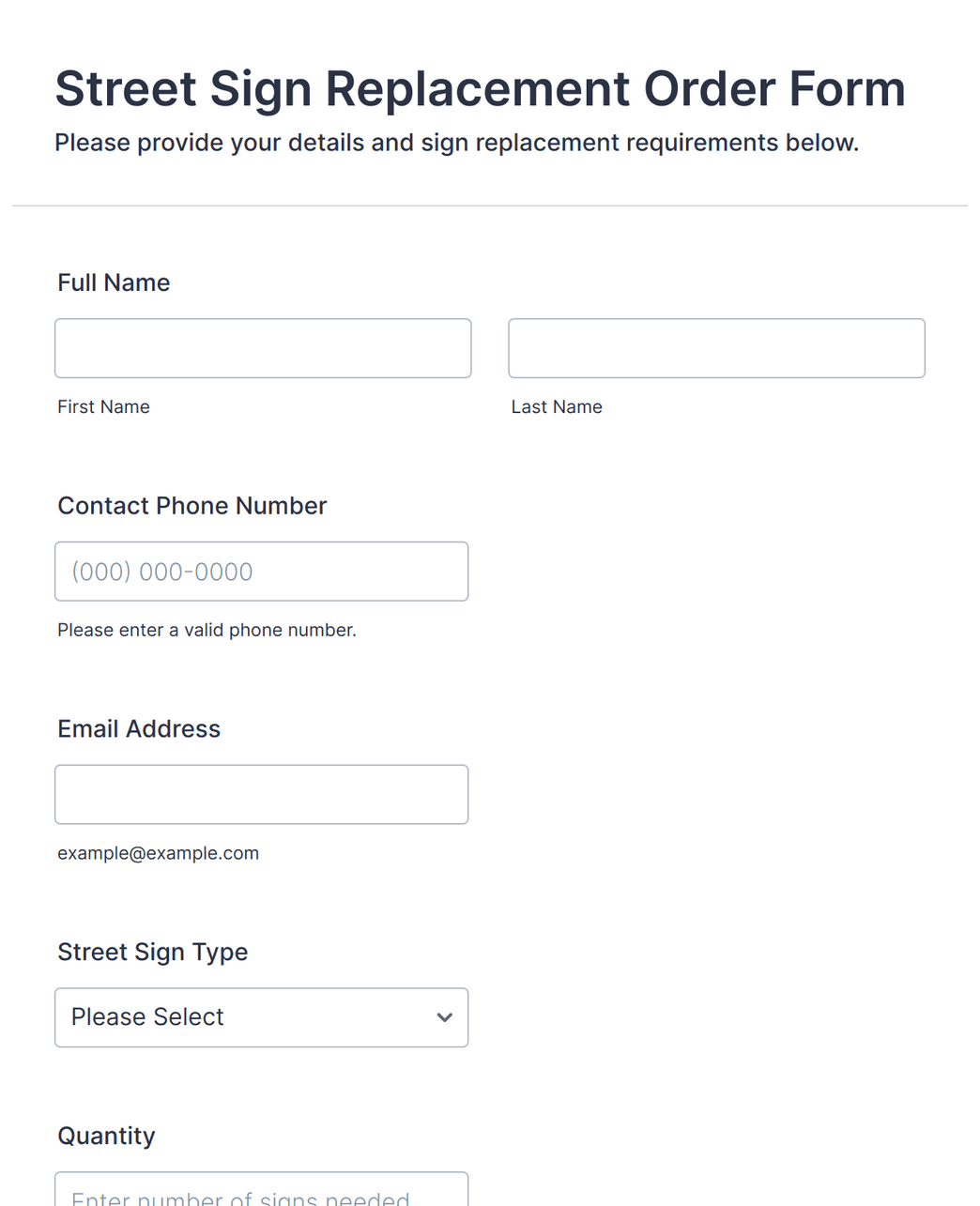 - For service orders, include fields like date/time pickers, dropdowns for service types, and text fields for special instructions.