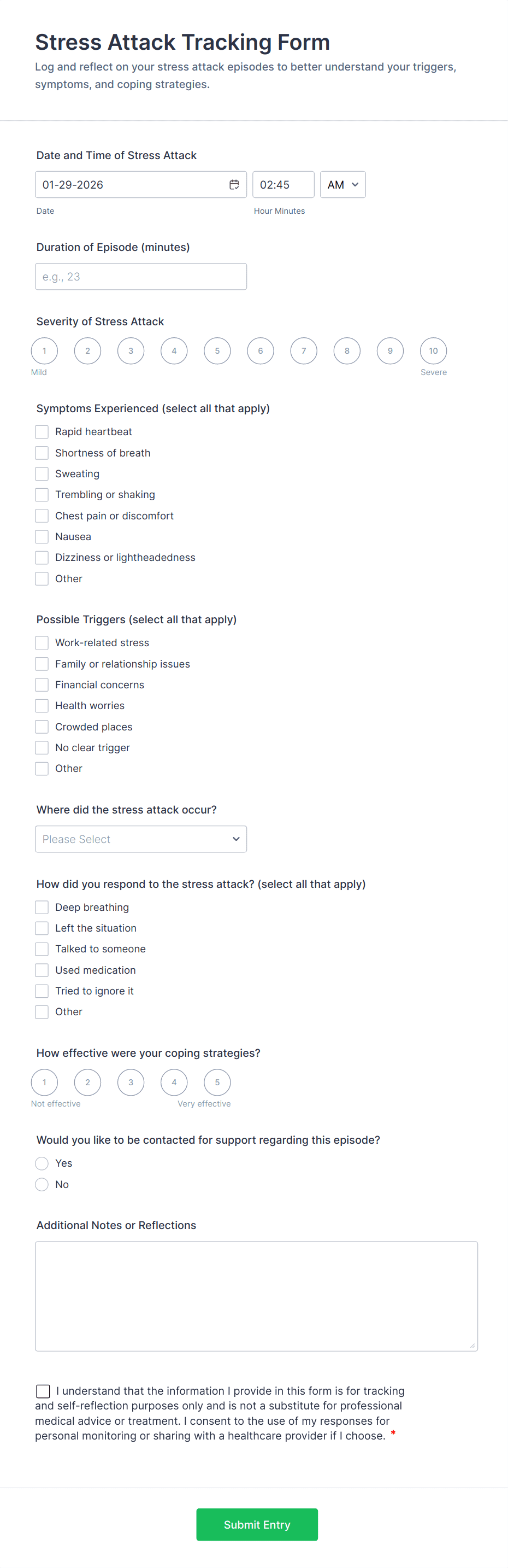 Conditional logic helps reduce unnecessary questions. For example, show follow-up questions only if someone reports high stress, low mood, or specific concerns. This makes the form feel shorter while still capturing important details.
