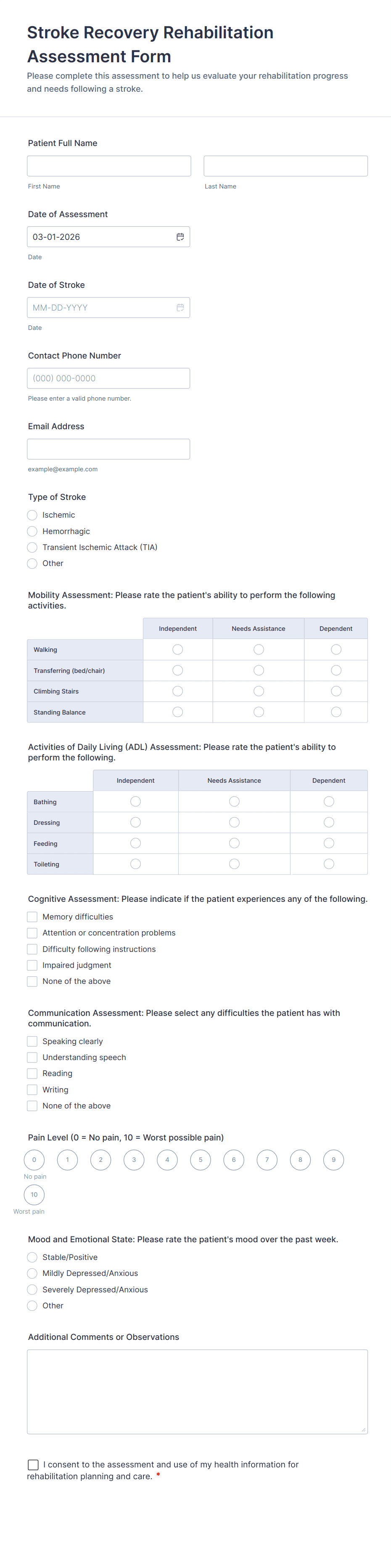 Add fields for symptoms, medical history, medications, allergies, lifestyle factors, and functional status depending on the assessment type. Use rating scales for severity and impact.