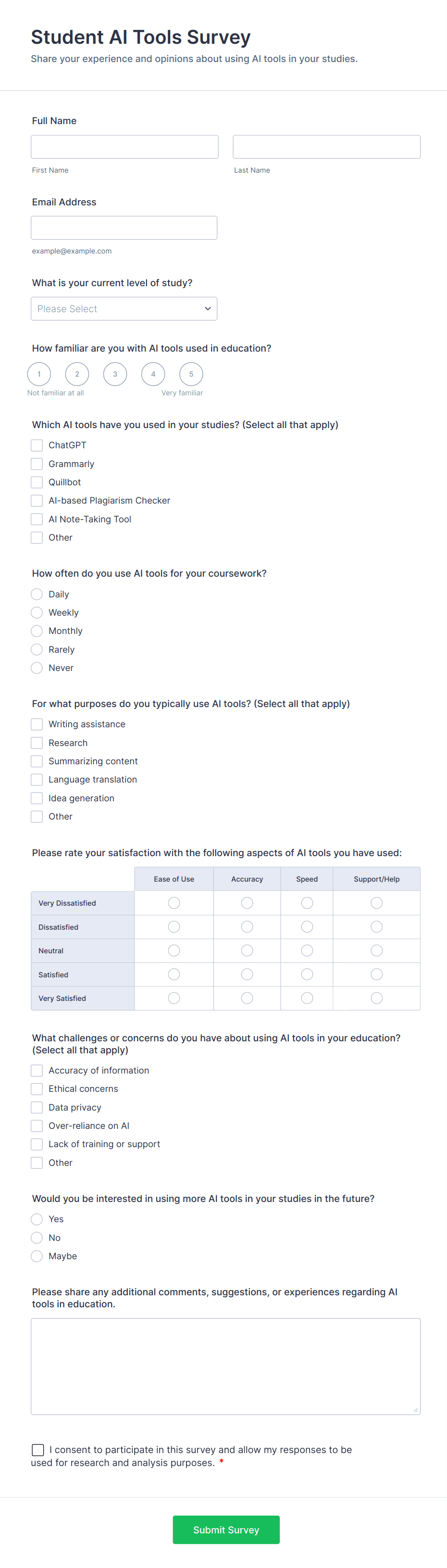 AI Agent Chat Interaction Feedback Form helps product and support teams collect user satisfaction scores and comments about AI chats, turning feedback into insights to improve AI experiences.