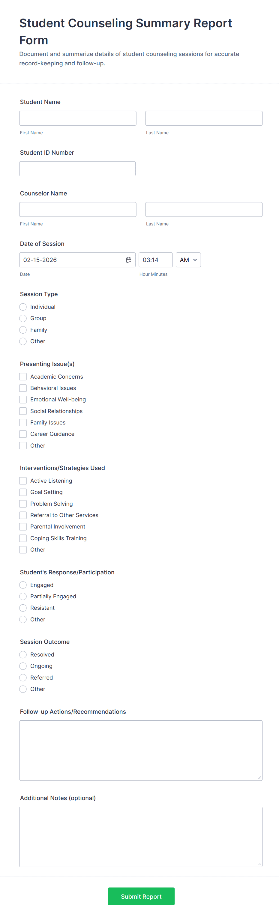 Common fields include student identification, reason for referral, session notes, parent/guardian consent, behavioral observations, and follow-up actions.