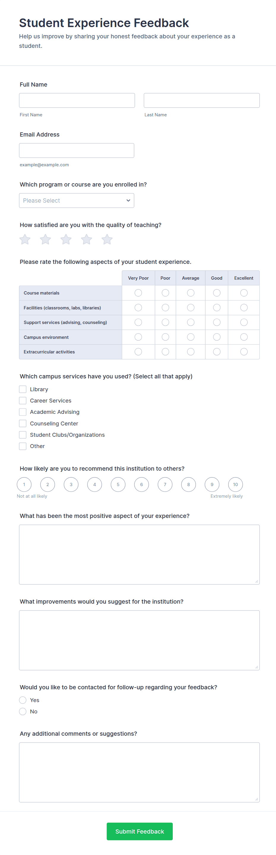 - Student Surveys: Focus on course content, teaching style, and classroom environment. May include rating scales, open-ended questions, and demographic fields.