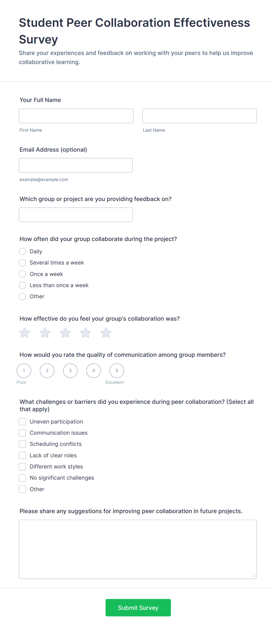 • For teacher or staff surveys: Include self-assessment fields, peer review sections, and narrative response options.
