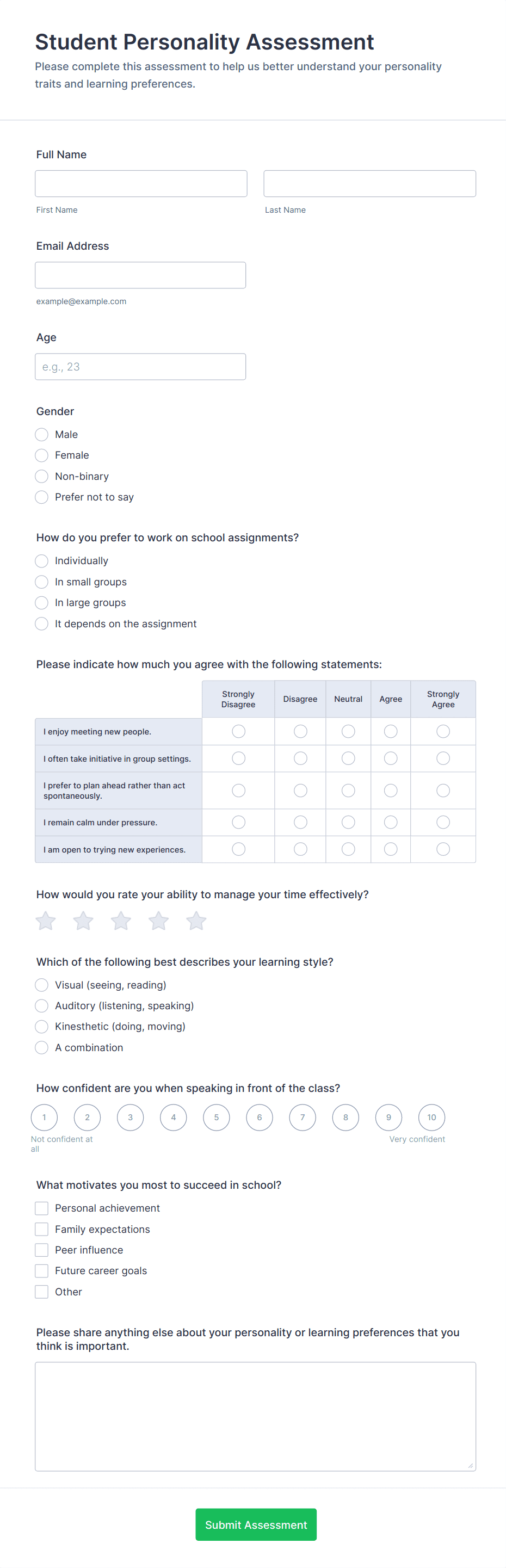 Creating a student assessment form with Jotform helps educators standardize evaluation while keeping assessment records organized and easy to review.