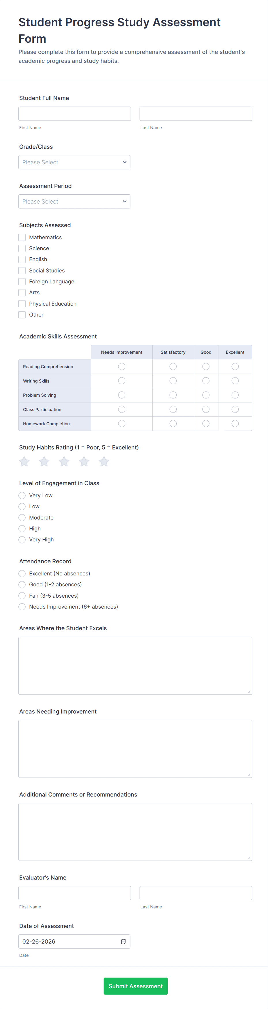 Student assessment forms support formal evaluation, ongoing progress tracking, and structured feedback. Below are common ways these forms are used and the challenges they help solve.